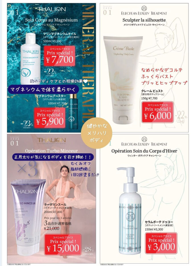 年末年始の不規則な生活が終わり、新しい年のスタート!心も体も、そしてお肌もキレイに磨いてスタートしたいものです。今月は手に取りやすい商品ばかりキャンペーンになっておりますので、これまでのスキンケアにプラスワンしていただき、冬のスキンケアをグレードアップしてくださいね。