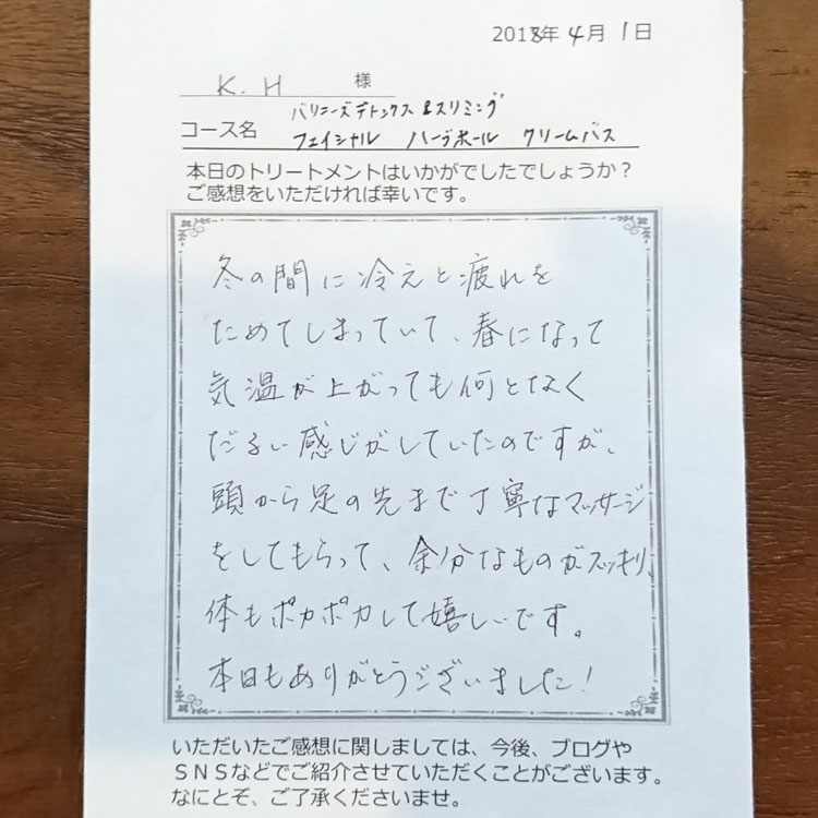 『冬の間に冷えと疲れをためてしまっていて、春になって気温が上がっても何となくだるい感じがしていたのですが、頭から足の先まで丁寧なマッサージをしてもらって余分なものがスッキリ!
