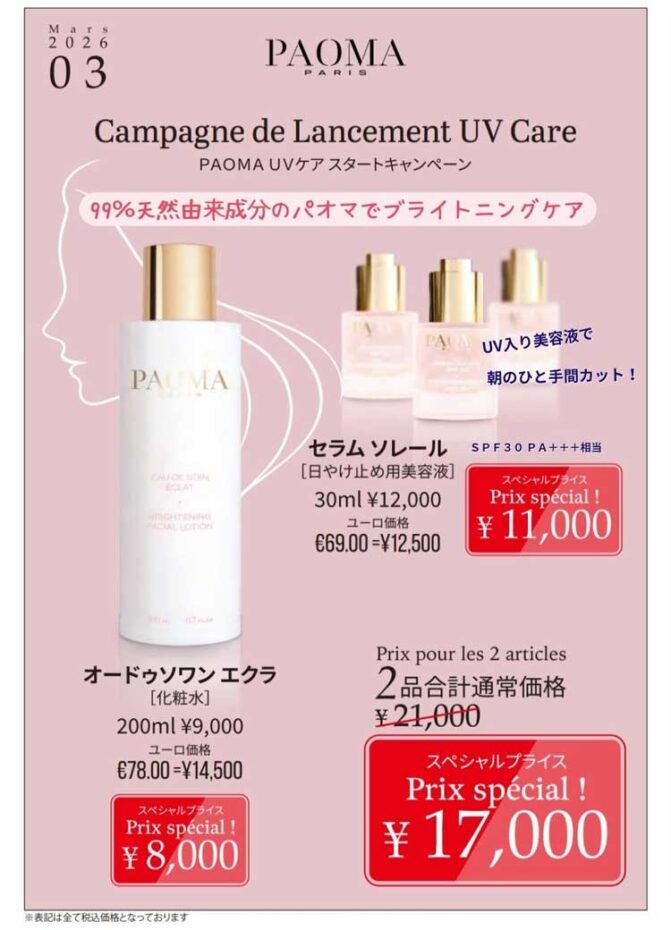 パオマのこの時期のおすすめは、ブライトニングラインのオードゥソワンエクラとセラムソレール。セラムソレールは、UV入りの美容液なので、朝、忙しい時に、美容液塗って~日焼け止め塗って~というひと手間が省けます。使用後は明るく艶やかなお肌に。