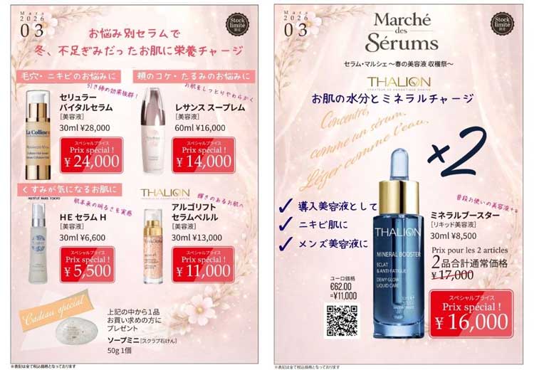 春のお悩み、なりたいお肌も人それぞれ異なります。また冬は血行不良、代謝不良でお肌の栄養も不足していますので、ミネラルブースターと、お悩み別セラムでしっかり栄養チャージしましょう。